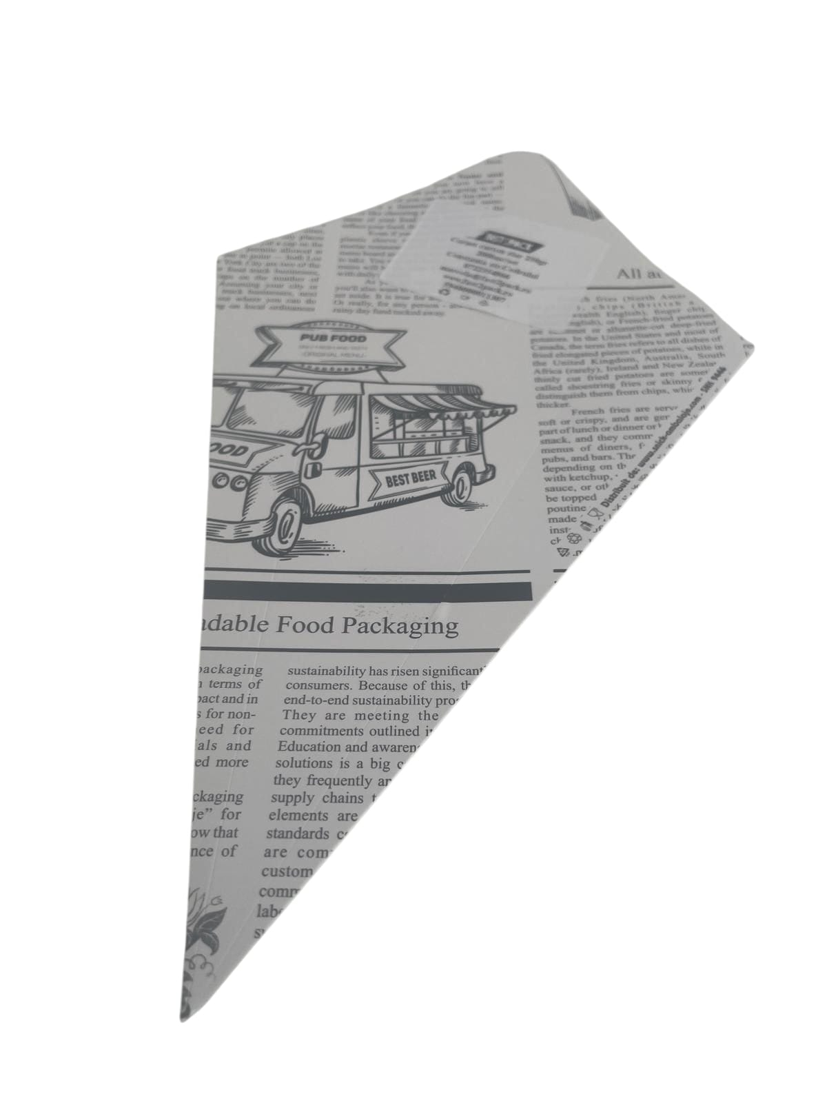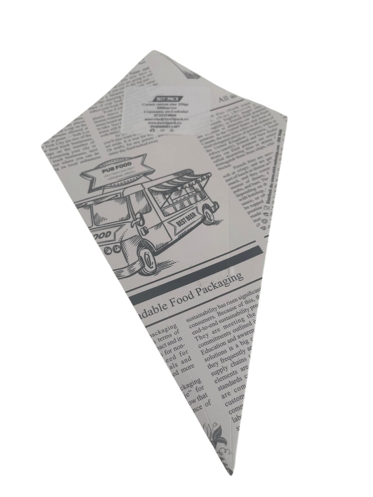Cornet carton  model ziar este alegerea perfecta pentru servirea cartofilor prajiti, churros si altor varii garnituri sau deserturi. Fabricata din carton reciclabil, cornetul ofera un ambalaj practic si sustenabil, perfect pentru restaurantele sau afacerile de tip fast food.