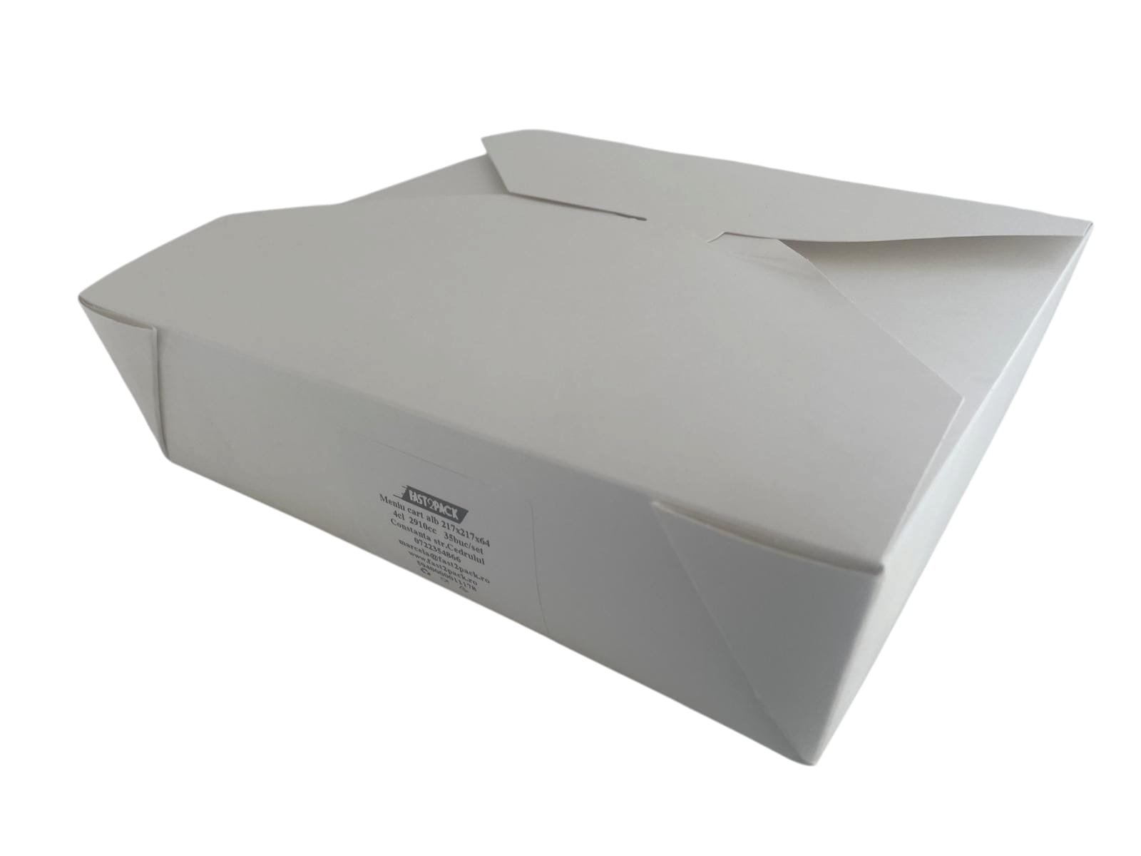 Cutia de meniu din carton alb de 4cl este soluția perfectă pentru restaurante, fast food-uri, și servicii de catering, oferind o metodă eficientă și elegantă de servire a preparatelor. Fie că este vorba de prânzuri de afaceri, comenzi la pachet sau evenimente speciale, aceste cutii sunt ideale pentru a oferi o prezentare ordonată și profesională pentru mesele tale.